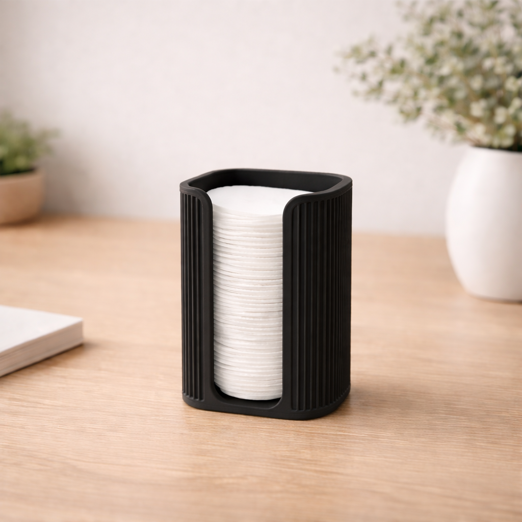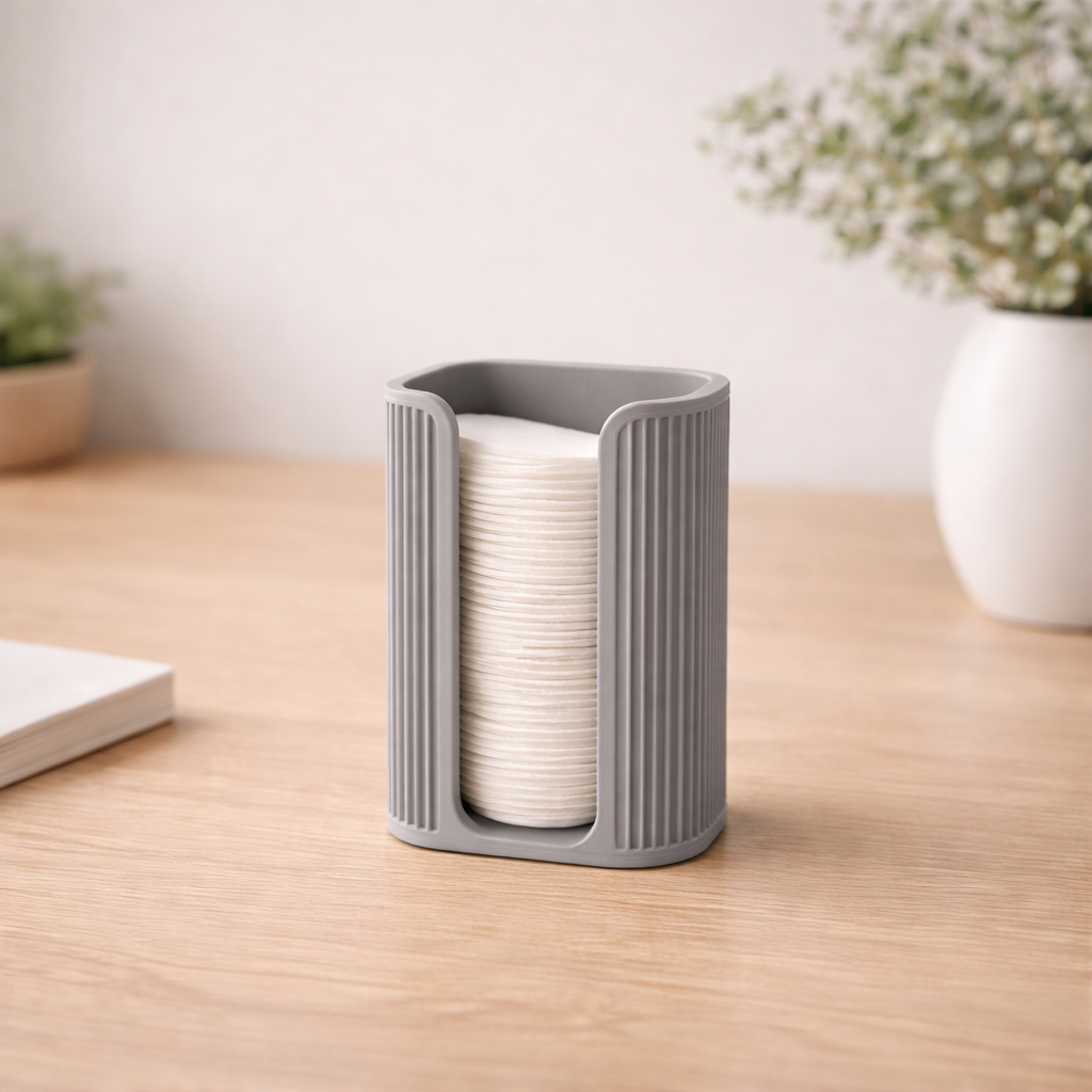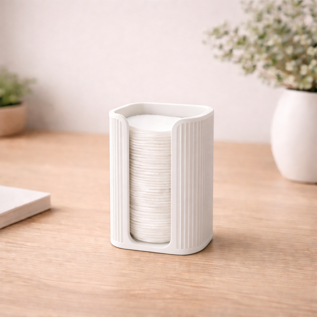 Dieser moderne Japandi Wattepadhalter ist eine praktische und stilvolle Ergänzung für dein Badezimmer. Er hält deine Wattepads sauber und griffbereit und sorgt für Ordnung am Lavabo. Die ruhige Form und die feinen Rillen passen perfekt zu einer schlichten Badezimmerdekoration. Der Halter ist 103 mm hoch und 68 mm breit. Er passt für Wattepads bis 60 mm Durchmesser
