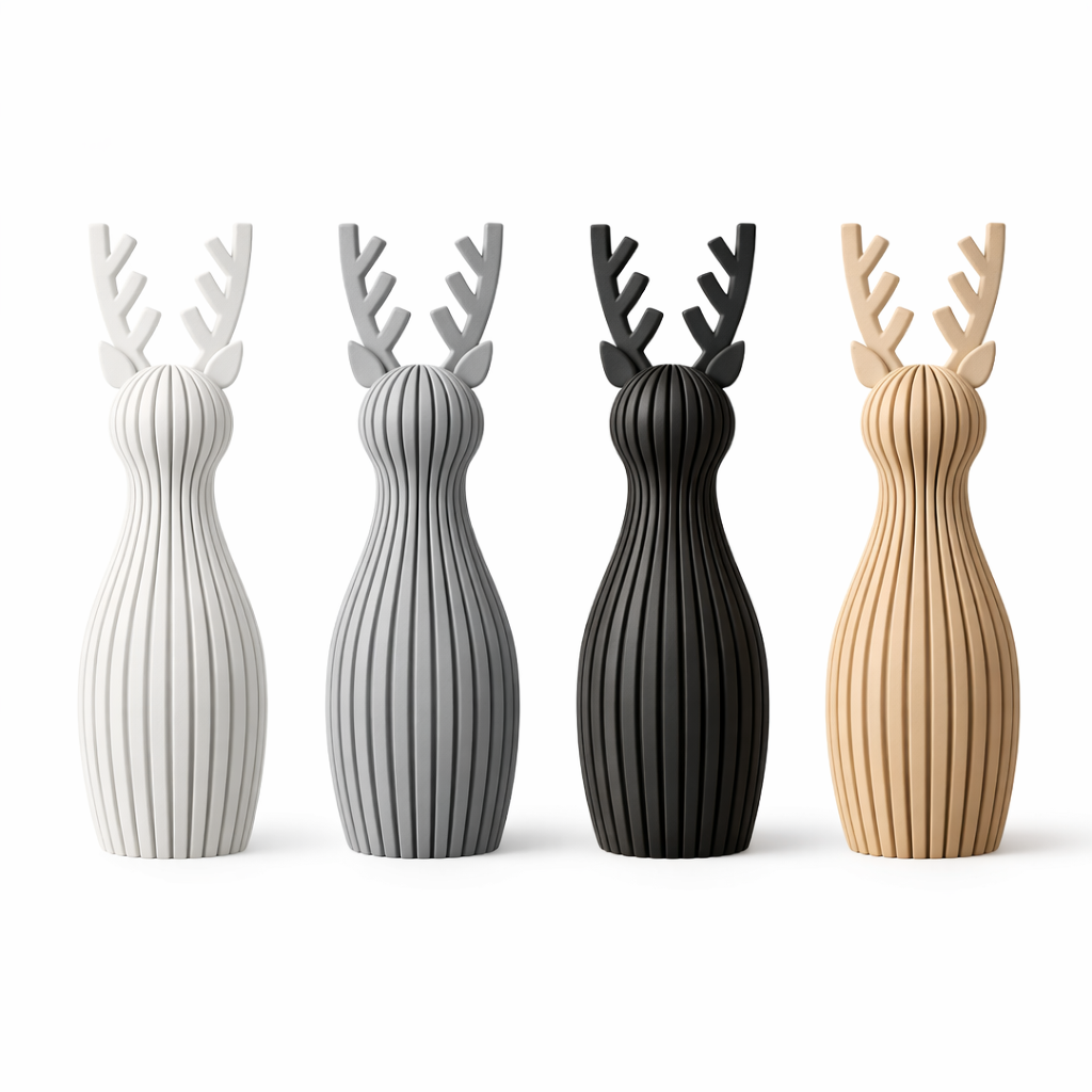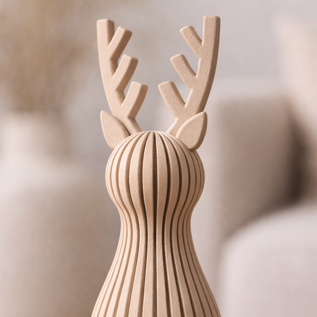 Diese Design Figur bringt ruhige Winter Stimmung in dein Zuhause. Die feinen Linien strukturieren den Körper klar und sorgen für einen modernen, gemütlichen Look. Die kleinen Ohren und das Geweih machen den Look süss, aber nicht verspielt. Perfekt als Deko auf Tisch, Regel oder Fensterbank, allein oder als Set in verschiedenen Farben
