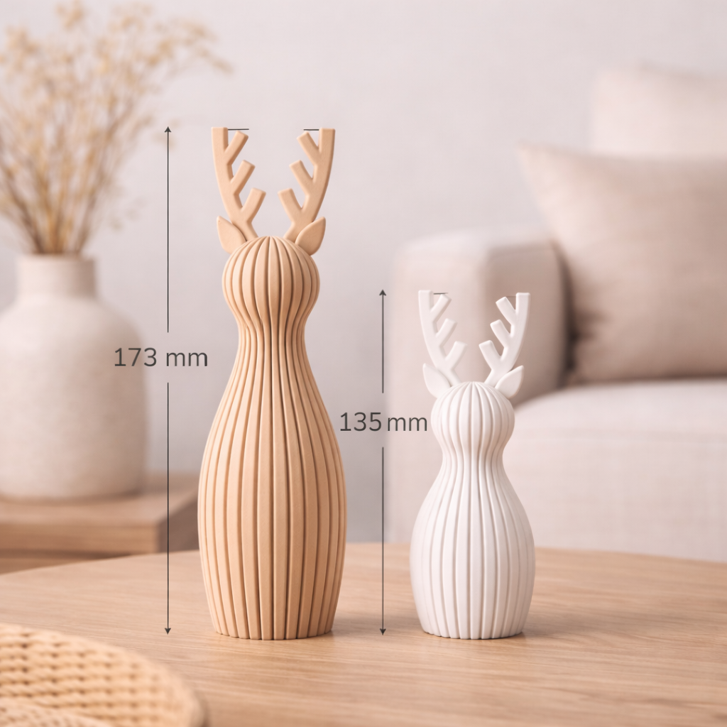 Diese Design Rentierfigur bringt ruhige Winter Stimmung in dein Zuhause. Die feinen Linien geben dem Körper eine klare Struktur und wirken modern und gemütlich zugleich. Die kleinen Ohren und das Geweih macht den Look süss, aber nicht verspielt. Perfekt als Deko auf Tisch, Regal oder der Fensterbank, alleine oder als Set in verschiedenen Farben.